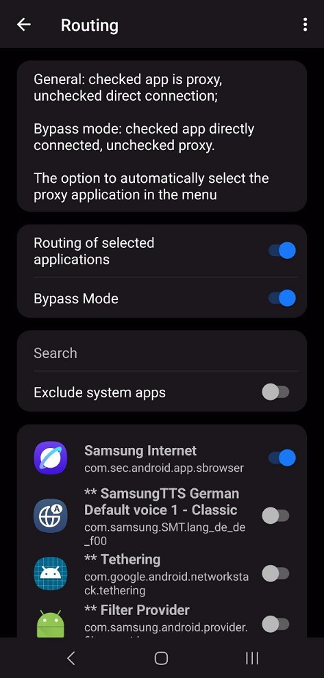 (4) در پایین صفحه، لیست برنامه‌ها نمایش داده می‌شود. اپ‌هایی که می‌خواهید بدون VPN (یعنی مستقیم به اینترنت وصل شوند) را انتخاب کنید.